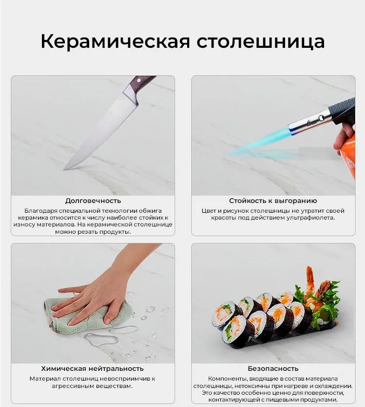 - Долговечность. Благодаря специальной технологии обжига керамика относится к числу наиболее стойких к износу материалов. На керамической столешнице можно резать продукты.